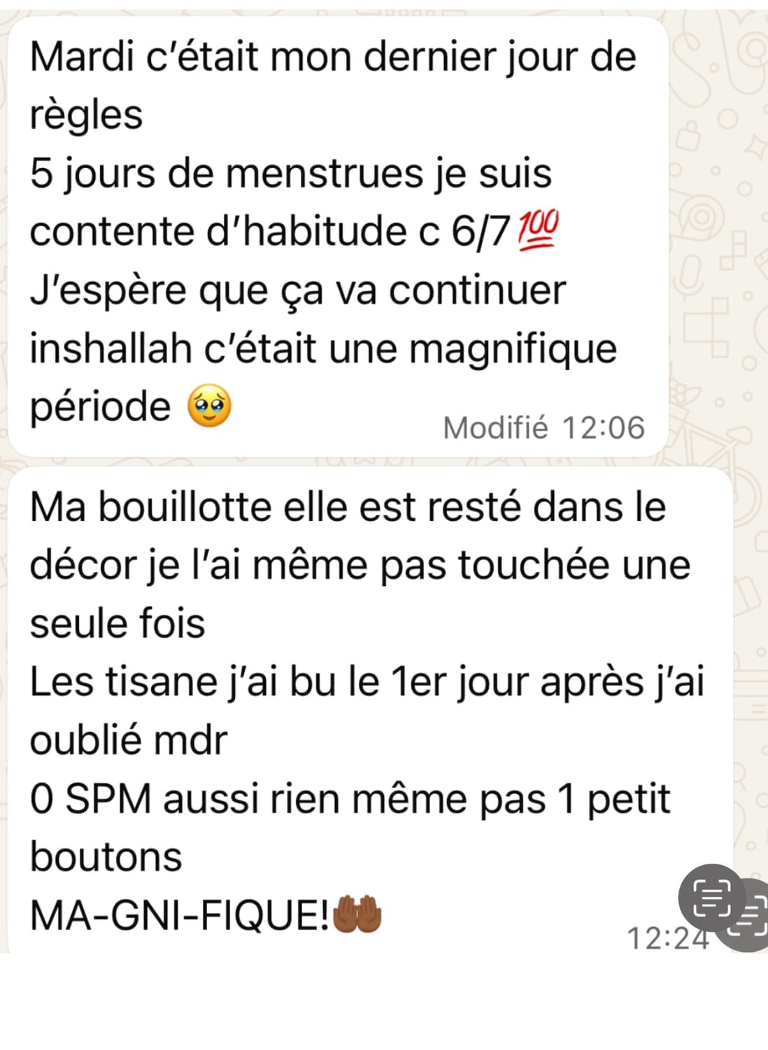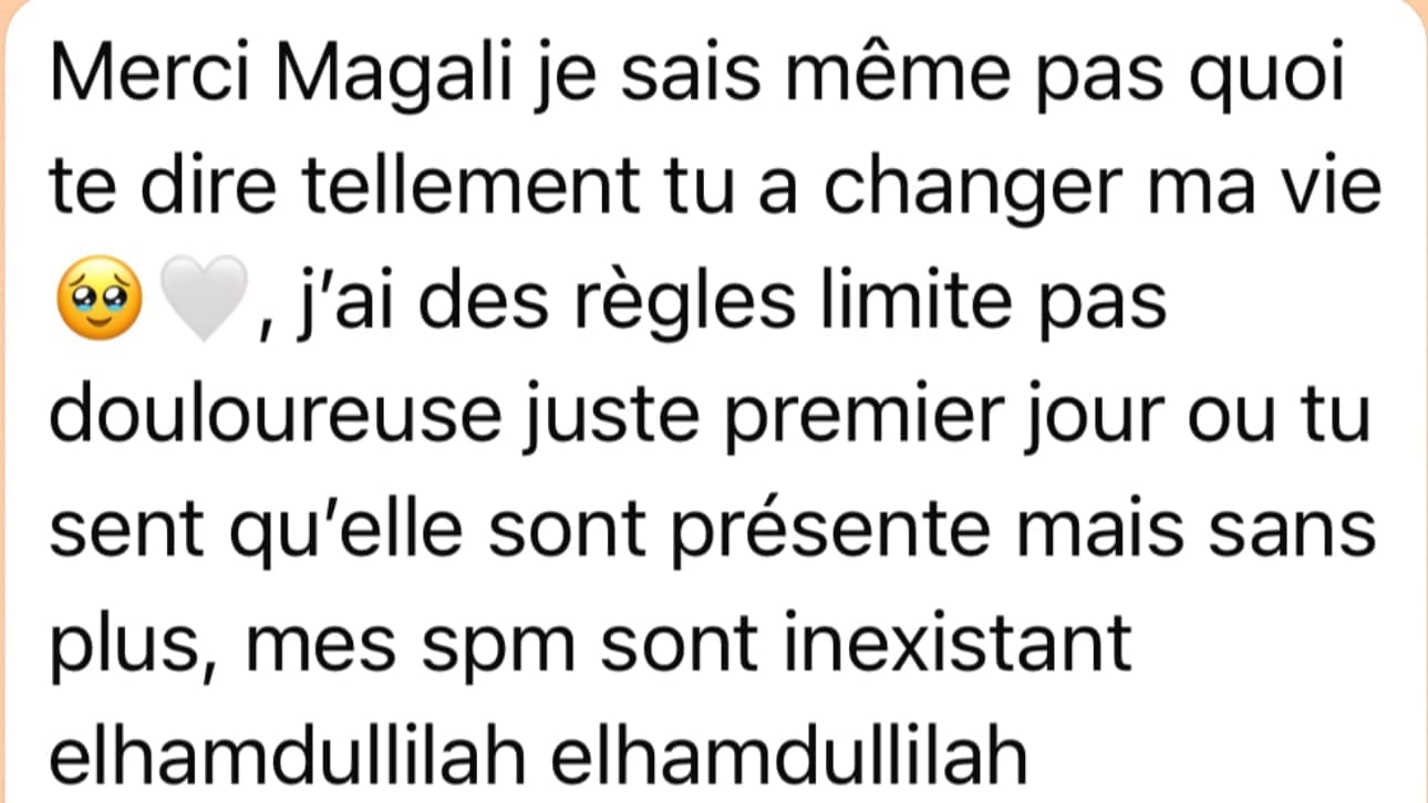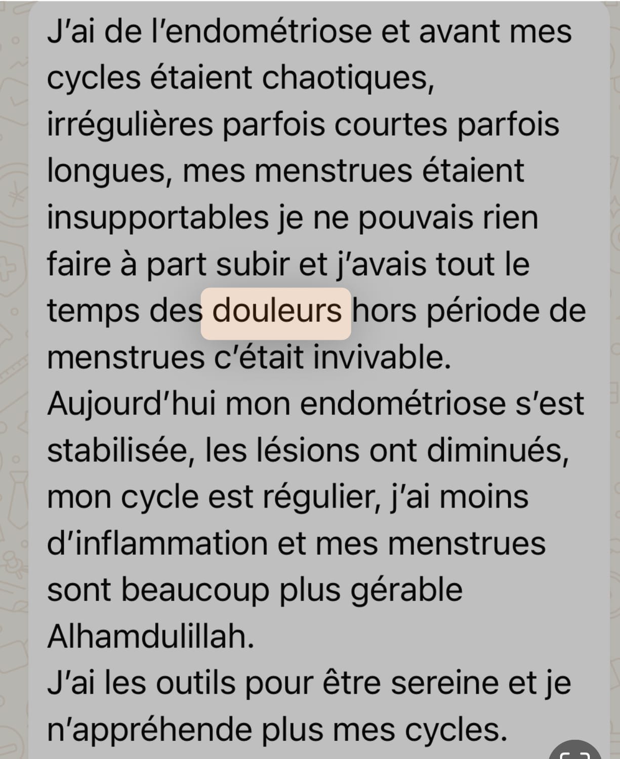 C’est en combinant naturopathie, nutrition selon la Sunna, soins naturels, hygiène de vie et spiritualité que j’ai retrouvé un cycle paisible, stable et une relation apaisée à mon corps par la grâce d'ALLAH.